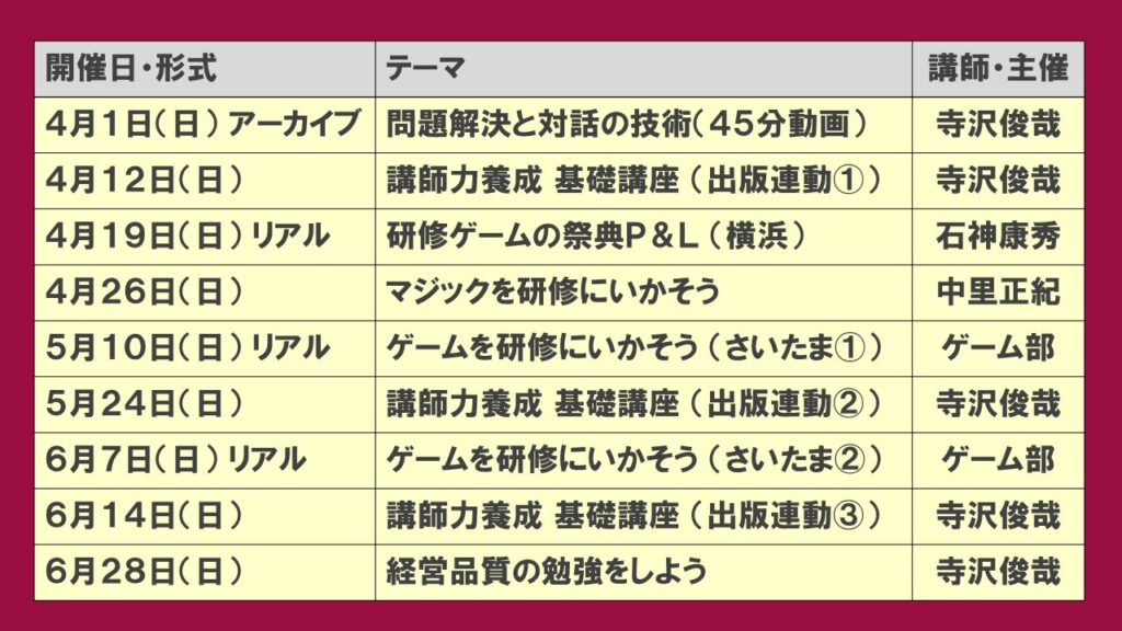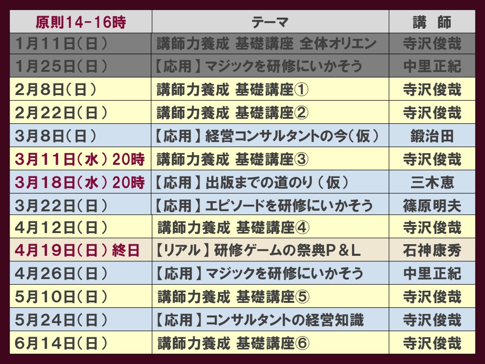 *この他、つど開催されるセミナーは、会員限定メルマガでご連絡します。これからのセミナー(原則第2.4日曜)
